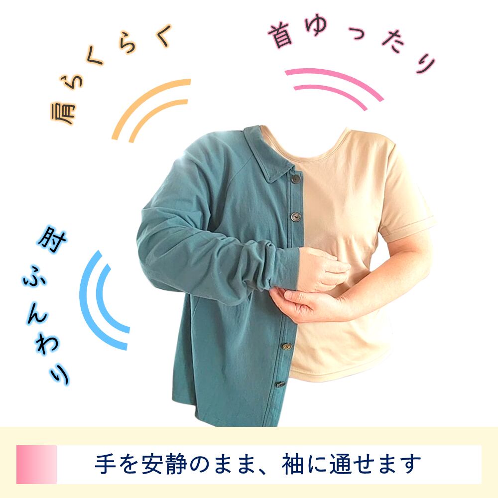 五十肩、首の痛み、関節の痛み、手が痛い、肩が痛い、指が動きづらい、高齢、骨折、脳卒中、片麻痺、拘縮、リウマチ、パーキンソン、認知症、着衣失行などの悩みがあり、着替えを簡単にしたい方。